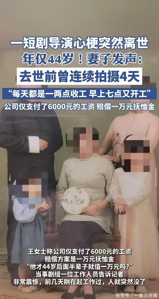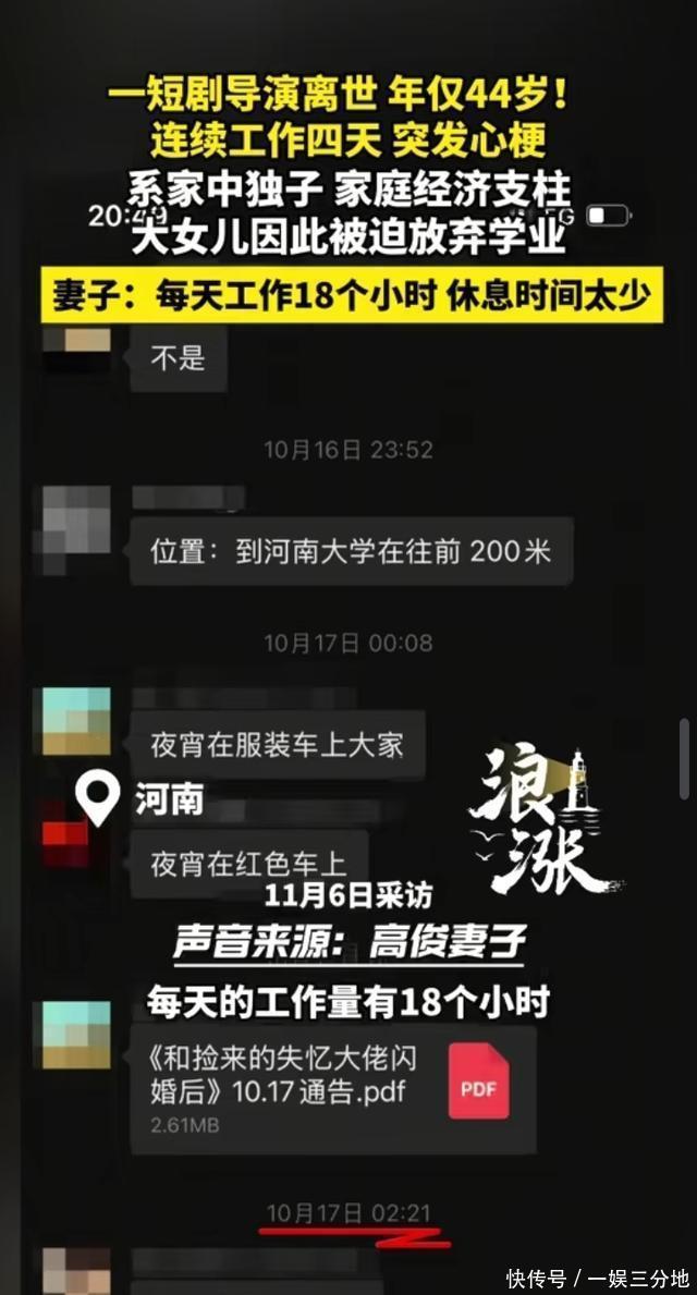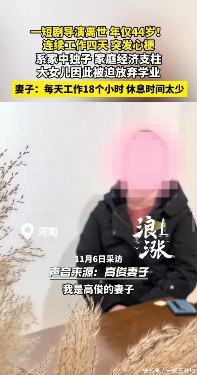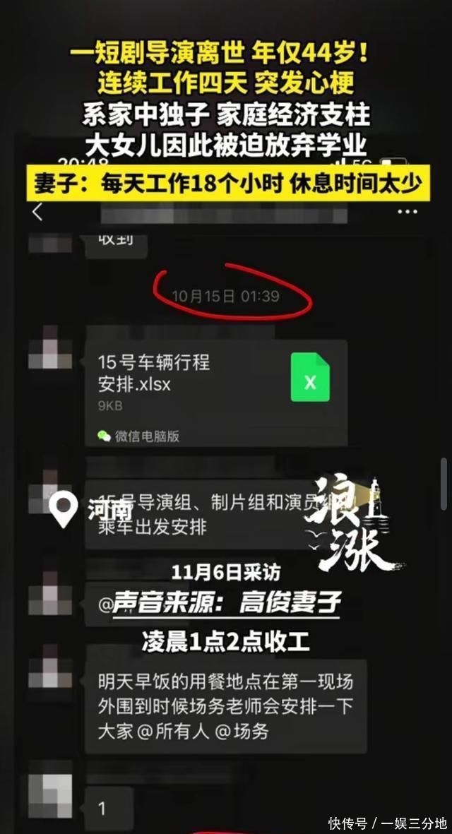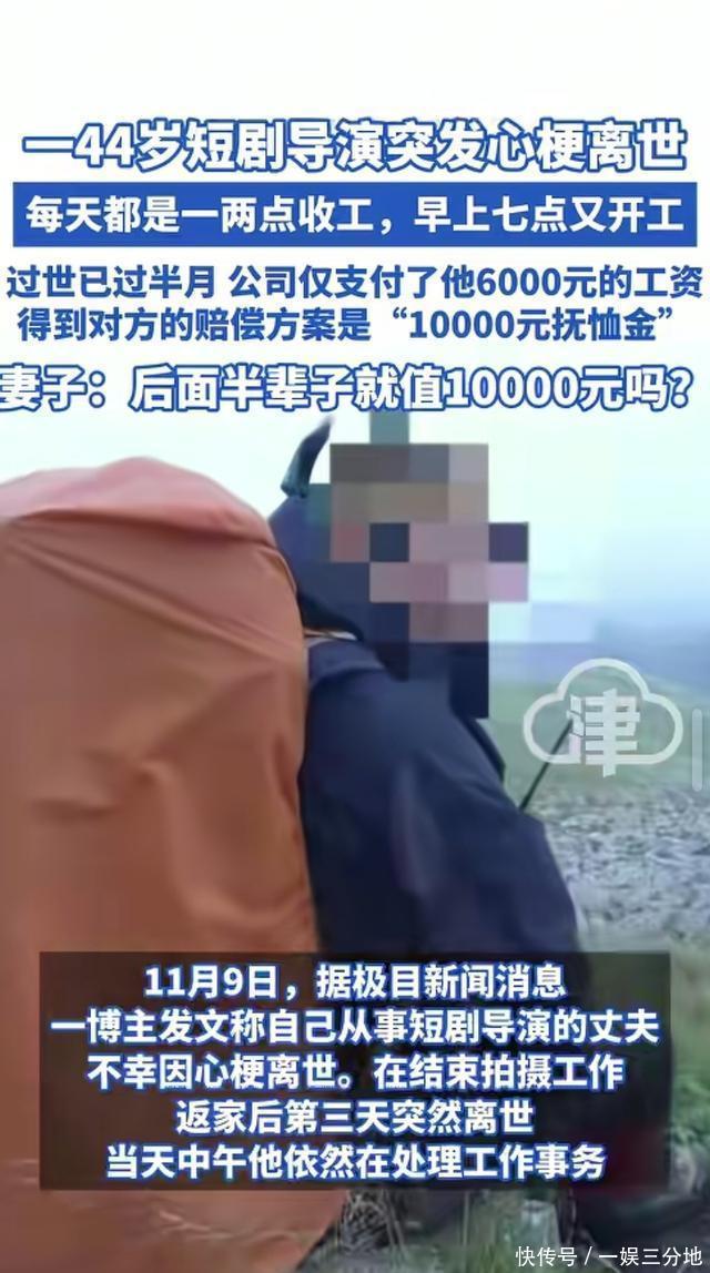 11月9日(报道),河南郑州。博主王女士发文称,自己从事短剧导演的丈夫不幸因心梗去世。结束拍摄工作后,返家后第三天突然离世,当天中午他依然在处理工作事务。从10月14日到17日,他每天凌晨一两点才能卸下器材收工,清晨七点又要准时出现在片场安排当日拍摄,四天里日均睡眠不足五小时。