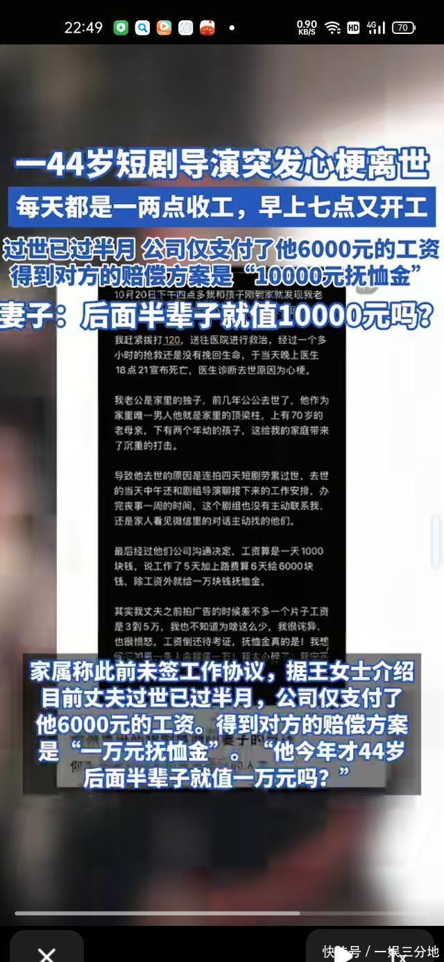 当事剧组工作人员表示,非常震惊,前几天刚在起工作过,人就突然没了。 高先生的离世,是一个家庭的崩塌,也是行业浮躁下的一声叹息。他用二十年光阴追逐光影梦想,以极致的敬业对抗着现实的挤压,却终究没能抵过超负荷工作对生命的透支。那些未完成的纪录片脚本、女儿们期盼、老母亲的守望都因为他的离世成为永远的遗憾,无法自拔。 在流量与效率被无限放大的当下,我们是否该停下脚步反思:当梦想需要以生命为代价,当敬业被异化为无底线的透支,这样的“坚持”究竟意义何在?高先生的遭遇不应只是一则令人惋惜的新闻,更应成为行业规范用工、社会重视劳动者健康权益的警示。愿他未竟的光影梦有人接续,愿他的家人能在法律的支撑下得到应有的慰藉,更愿每个为生活与梦想打拼的人,都能被世界温柔以待,不必在奔跑中弄丢了自己。 高先生,一路走好!